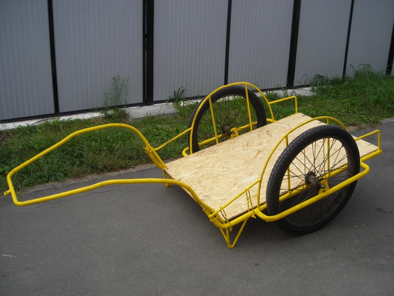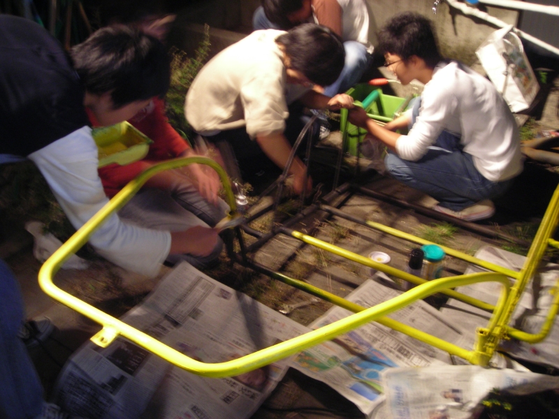 改造作業をする担当スタッフ中古あるいは廃棄処分の人力車(通称リヤカー)を移動ステージに改造する作業が進んでいます。シャーシー整備の後、フレームとボディを組上げて、台車自体が演奏楽器のようになる予定です。街に直接音楽パフォーマンスを届けるために、この移動ステージは重要な役割を果たします。